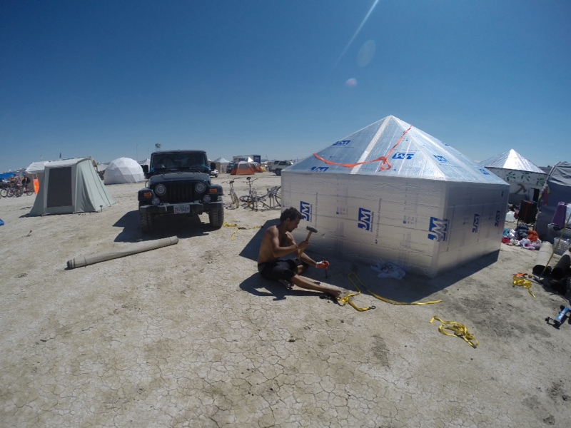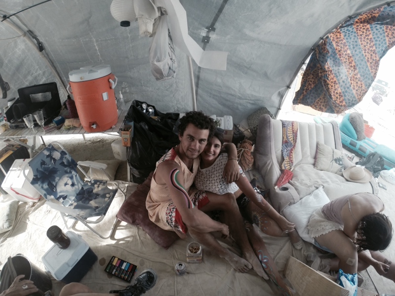 We pull in to our camp to find my long lost friend Ryan hunched over like an aging lumber jack, tossing firewood into a burn barrel, and we know we’re home. Other campmates start to filter in, each with their own harrowing story of the long and silly entry into this city of misfits. There are nine of us camping together, and we’re just getting started!