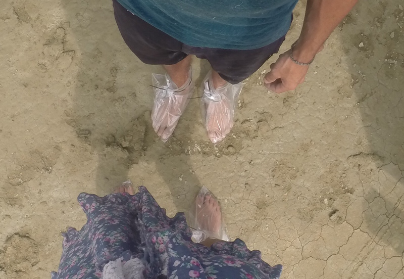 So we make shoes out of ziplock bags to make it to the outhouses without collecting giant, heavy clumps of desert clay on our feet!