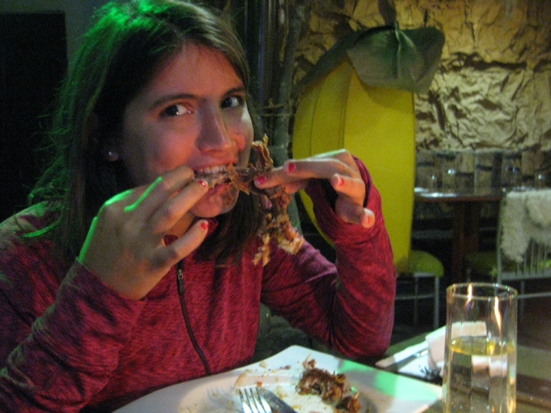 On décide de se lancer et d’enfin commender le fameux “cuy”. Le cochon d’inde nous est servi entier, avec la tête coupée et présentée sur le reste du corps, évidemment tournée vers moi.
