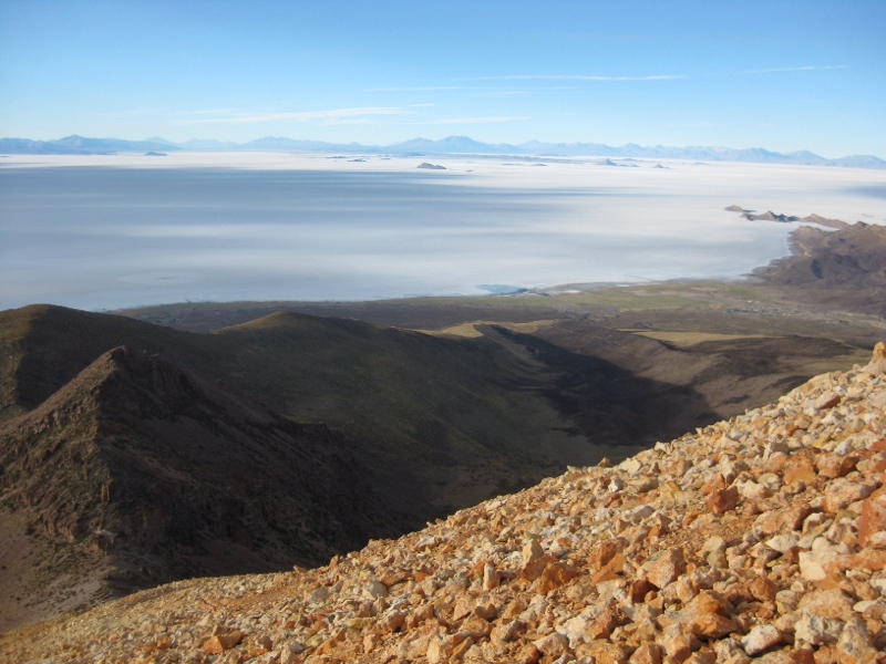Looking out onto the salt flat from this height, it is tough to comprehend. I keep thinking it’s the ocean, until I see a car driving across its surface, and the illusion is undone. Amazing views in all directions.
