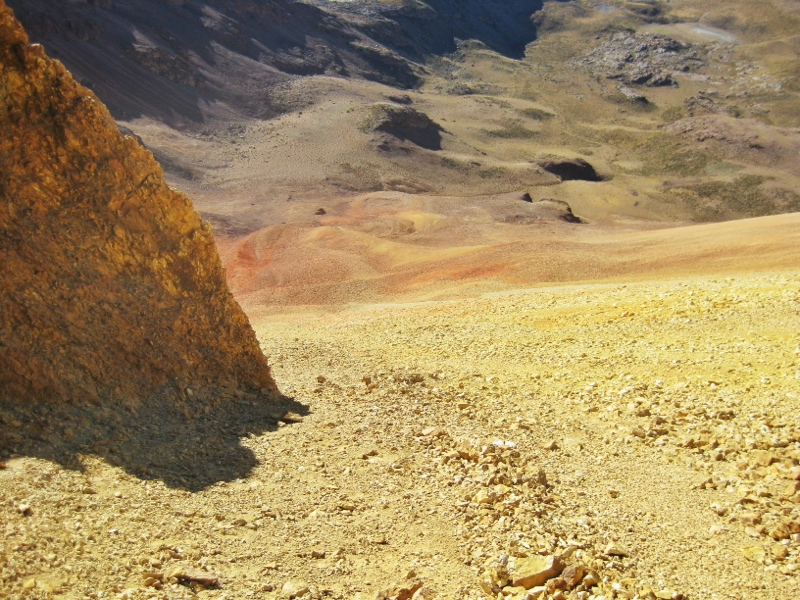As we begin the descent, we realize we can actually surf down the mountain by jumping on the steep, loose rocks and riding the ensuing mini-landslide. We make it down fast.