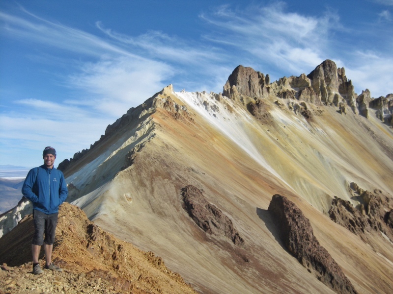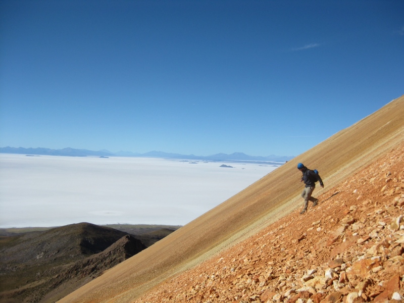 We happily reach the top, and we’re over 5000m, high above the salt flats below.