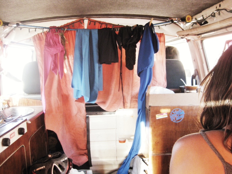 Nous rejoignons donc le couple et notre guide hippy après déjeuner et montons dans son van. Voilà à quoi ça ressemble assis sur le matelas à l’arrière: