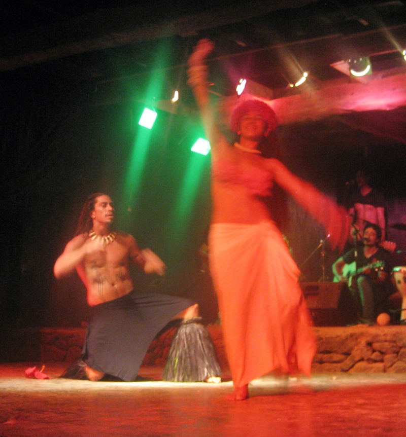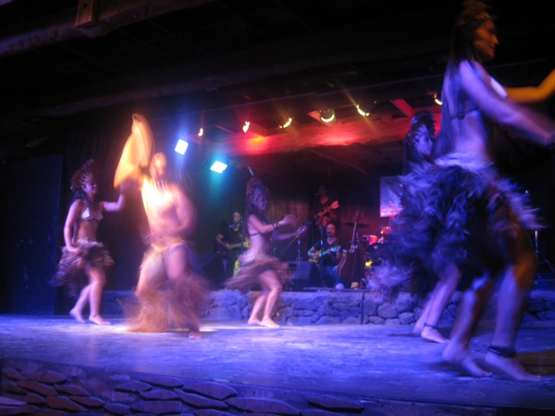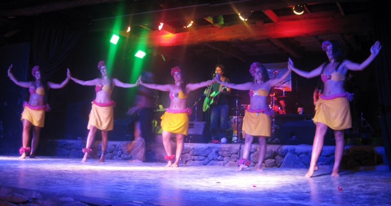Notre dernière soirée nous assistons à un spectacle de danse traditionnelle Rapa Nui, assez similaire aux danses tahitiennes ou hawaiennes. C’est un groupe de plusieurs filles en jolies costumes qui se déhanchent sur des chansons traditionnelles tandis que deux hommes presque nus mais peints de la tête aux pieds sautent agressivement de parts et d’autres de la scène. A un moment, un des danseurs sautent de la scène jusque devant les spectateurs, et nous arrose au passage de sa sueur.