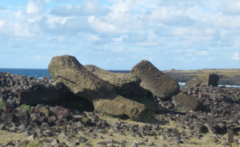 Les premiers européens à poser le pied sur l’île arrivent en 1720 et décrivent les mo’ai comme étant tous debout. Dans les années suivantes, une violente guerre civile entre les différents clans éclate. Cette guerre est probablement dûe à la surpopulation de l’île à l’époque et à la rebellion des clans les plus pauvres qui ne veulent plus travailler comme des esclaves à la construction et au transport des mo’ai, qui deviennent de plus en plus grands et lourds. Suite à cette guerre, en 1780, la majorité des mo’ai ont été renversés et leur construction cesse définitivement, puisque les habitants de l’île ne croient plus en la représentation des ancêtres, et une nouvelle religion émerge.